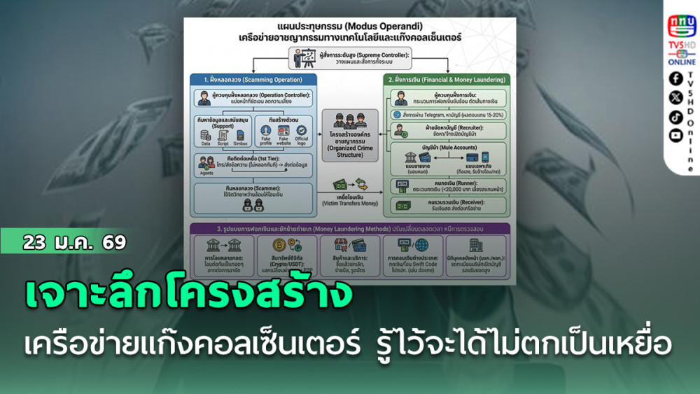2.ฝั่งการเงิน (Financial & Money Laundering): เมื่อเหยื่อโอนเงิน เงินจะไหลเข้า "บัญชีม้า" ที่มีทั้งแบบขายขาดและรับจ้างโอน มีทีม "คนกดเงิน" (Runner) และ "คนรวบรวมเงิน" เพื่อส่งต่อไปยังเครือข่าย